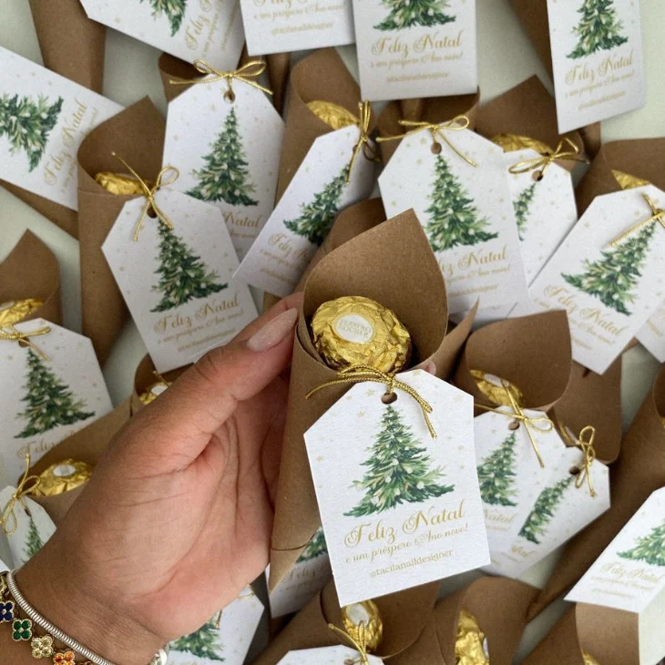 Raminho de alecrim, pinha, canela em pau ou um galho seco podem virar enfeites charmosos amarrados na embalagem. Esses detalhes naturais trazem aquele clima acolhedor e rústico que combina perfeitamente com o espírito natalino.
