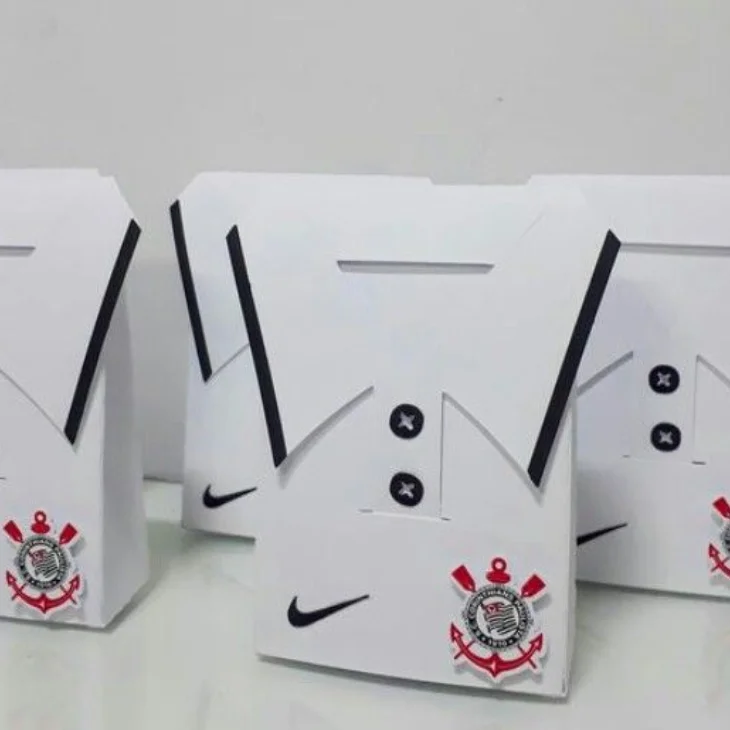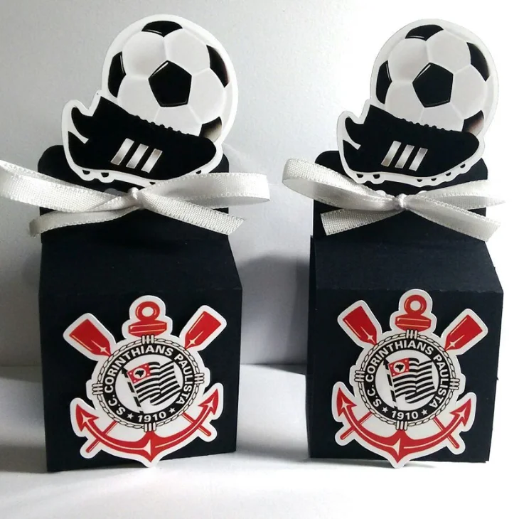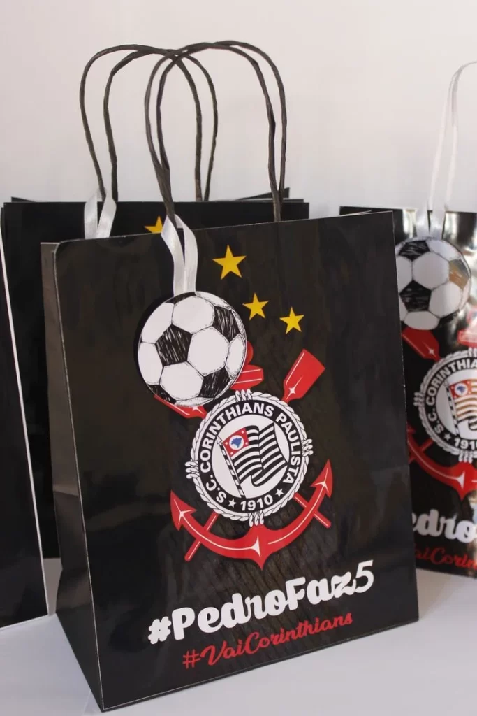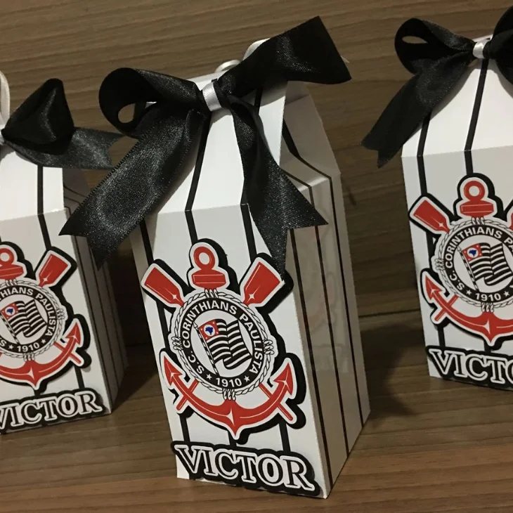 A apresentação faz toda a diferença no impacto final da lembrancinha. Use materiais nas cores preto e branco para manter a identidade visual do Corinthians. Saquinhos de celofane, caixinhas de papel kraft ou sacolinhas de TNT são opções versáteis.